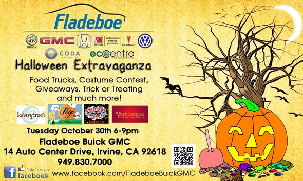 On Tuesday October 30th, 2012, Fladeboe Automotive is hosting a Halloween Extravaganza on their Buick/GMC lot from 6:00pm till 9:00pm. This is a family friendly event where Halloween costumes are welcomed and encouraged! Fladeboe will be having a costume contest during the event as well as giveaways, trick or treating, and much more. There will be Orange County favorite Food Trucks including, The Bakery Truck, Waffle-icious, Mustache Mike’s Italian Ice, The Viking Truck and The Flip Truck, for our guests to enjoy from 6-8pm, during this event.