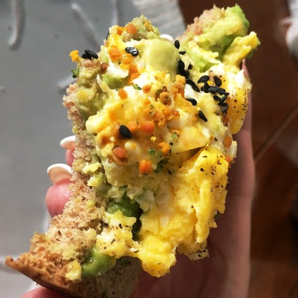 This recipe can be breakfast or a post-workout snack. Egg, avocado, sprouted bread sprinkled with a little bee pollen and black sesame seeds, which provide calcium.