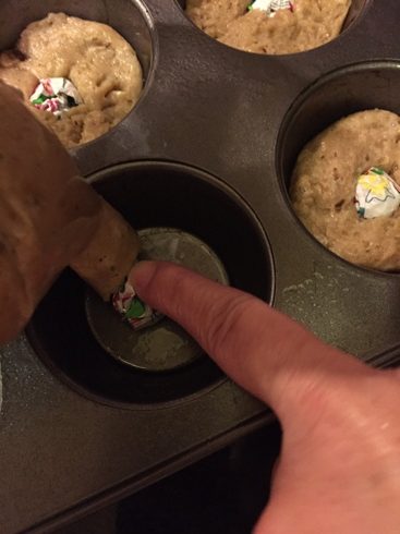 Next hurdle? Finding a donut pan. Who owns a donut pan? Not any of my friends and neighbors anyway. Sure, I could drive 20 minutes to a fancy store and probably buy one but instead I tried more practical stores like Target, Michael’s, my local grocer, friends and neighbors with no luck. No donut pans anywhere and most people had never heard of one. For the record, had I been able to find a donut pan two weeks ago, this recipe would have been posted sooner. Hmmmm, what to do? Improvise! I purchased some inexpensive baking cups, wadded them up in a ball and had my friend hold the ball in the center of a muffin tin while I filled the muffin cup with batter.