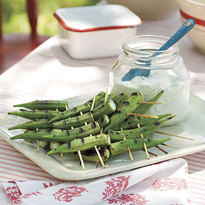 Tomatoes and onion are threaded onto skewers with fresh okra, glazed with a special sauce and placed on a hot grill. An easy and creative way to serve fresh okra, these skewers are delicious as a side dish to grilled chicken or steak.