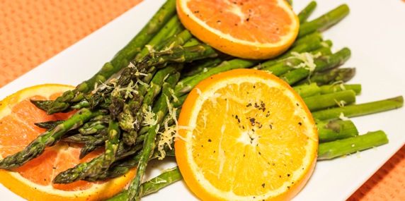 Combine asparagus wtih all ingredients in a large bowl, making sure the asparagus is covered with the juice from the oranges and the seasonings are distributed evenly.